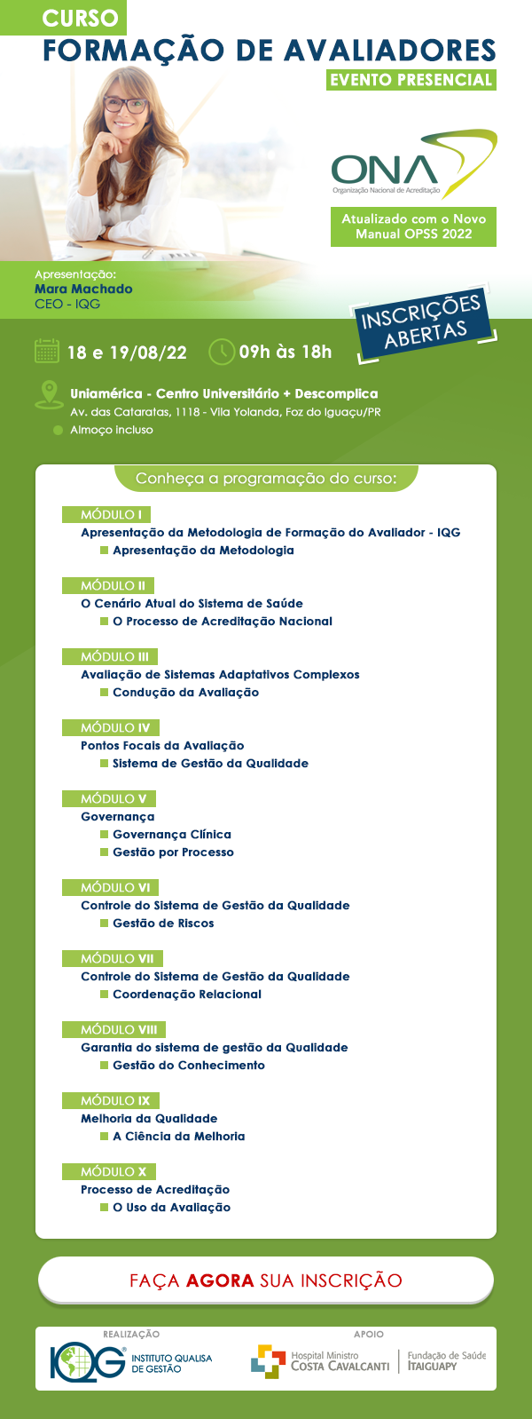 O Instituto Qualisa de Gestão (IQG) e o Hospital Ministro Costa Cavalcanti (HMCC) realizam nos próximos dias 18 e 19 de agosto, em Foz do Iguaçu (PR), o Curso de Formação de Avaliadores. O evento retoma o formato presencial, após dois anos, com o objetivo de promover a capacitação de profissionais da saúde que desejam iniciar ou aprimorar a atuação como Avaliador do Sistema Brasileiro de Acreditação.