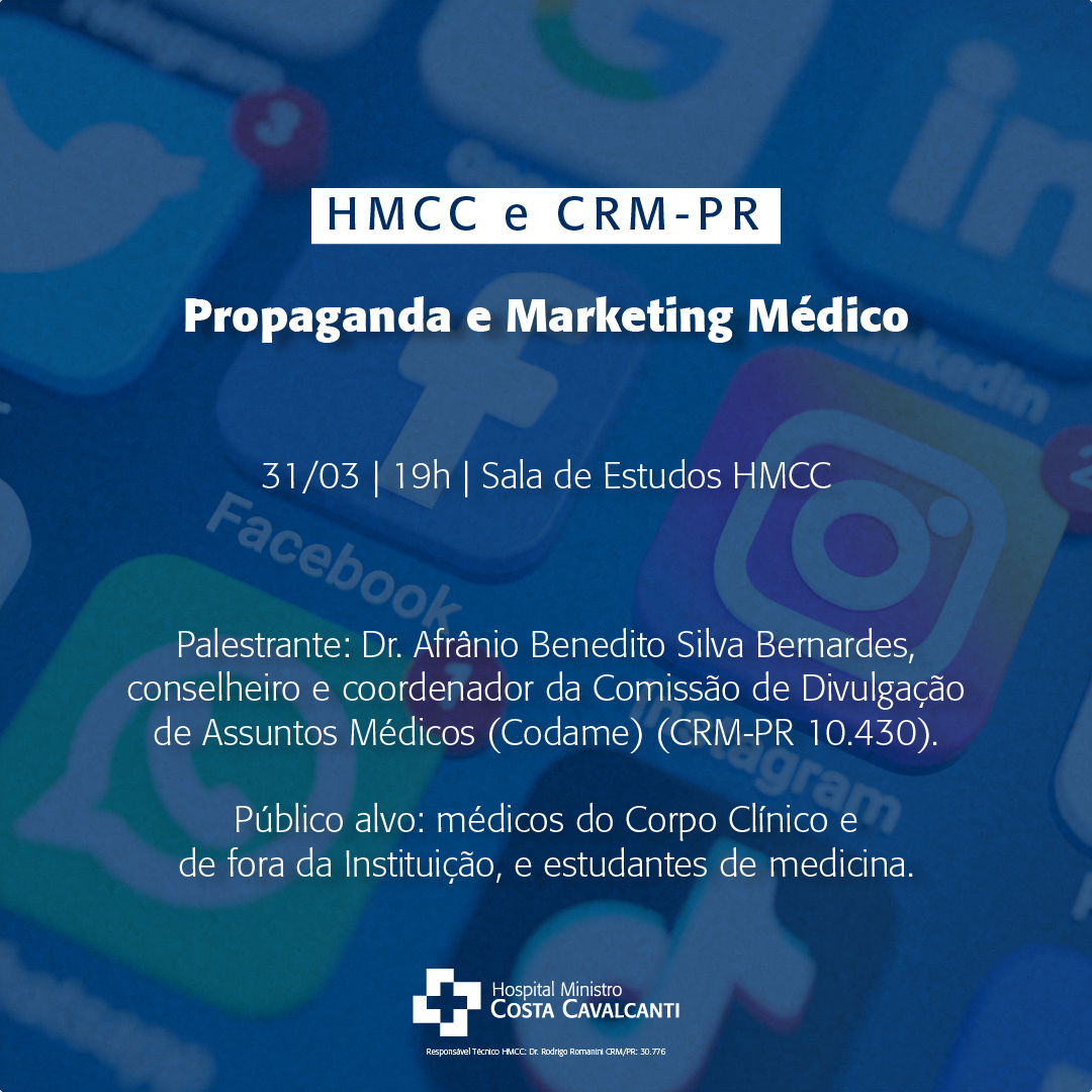 “Propaganda e Marketing Médico” será o tema do primeiro encontro do ciclo de palestras 2023 do Conselho Regional de Medicina do Paraná (CRM-PR) no Hospital Ministro Costa Cavalcanti (HMCC). O encontro será no dia 31 de março, às 19h, na sala de estudos, e a palestra será ministrada pelo conselheiro […]