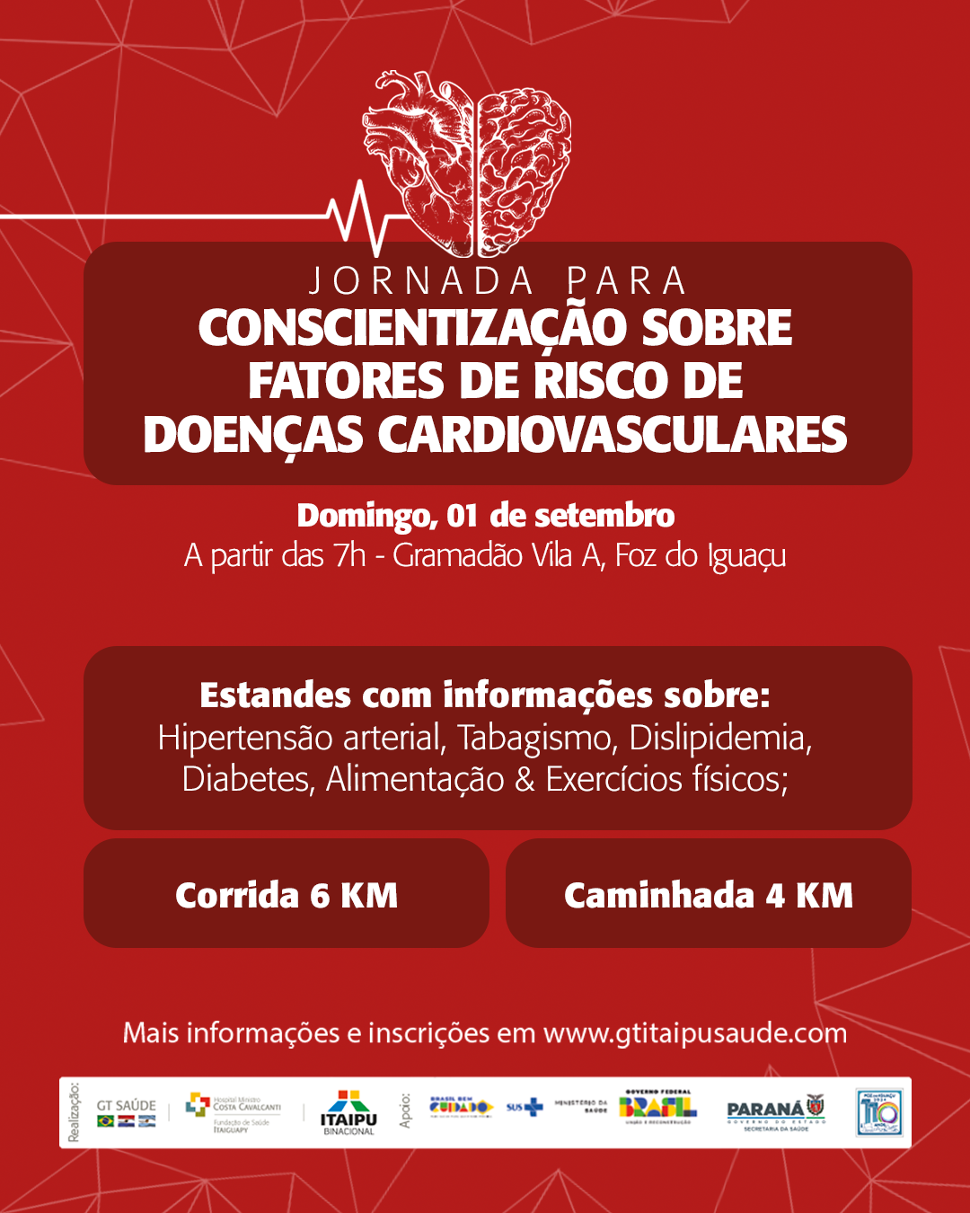 Evento promovido pelo GT Itaipu Saúde e parceiros será no dia 1º de setembro. Inscrições para caminhada e corrida já estão abertas. A Jornada para conscientização sobre fatores de risco de doenças cardiovasculares levará serviços de saúde ao Gramadão da Vila, no dia 1º de setembro, a partir das 7h. […]
