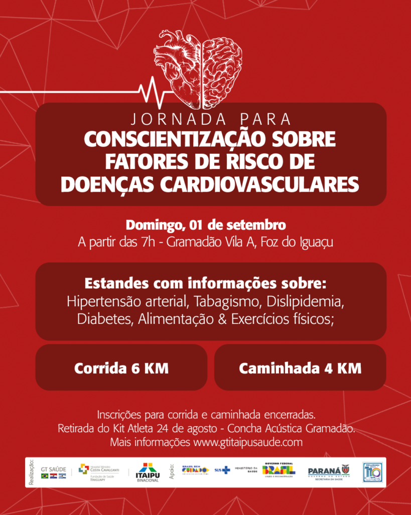 A menos de 30 dias da Jornada para conscientização sobre fatores de risco de doenças cardiovasculares, o Grupo de Trabalho Itaipu Saúde (GT Itaipu Saúde) – organizador da ação – já confirma os serviços que serão ofertados à população de forma gratuita, no dia 1º de setembro, no Gramadão da Vila A, das 7h às 11h. A proposta é aumentar o conhecimento sobre os fatores relacionados às doenças. O evento é proposto pela comissão técnica de doenças crônicas.